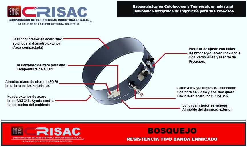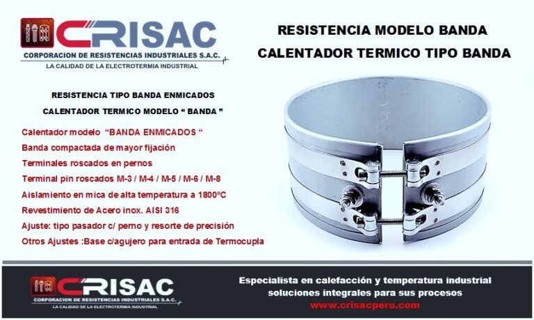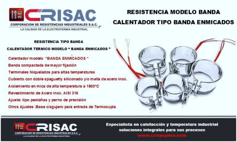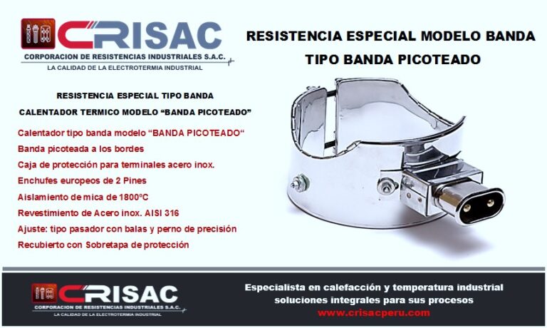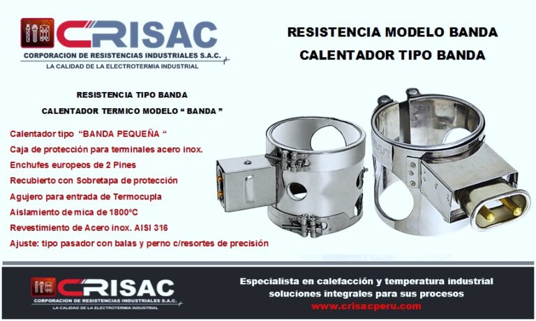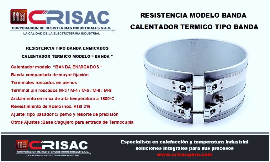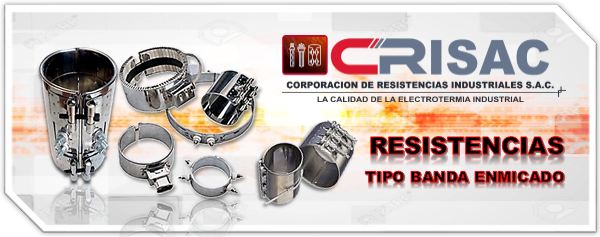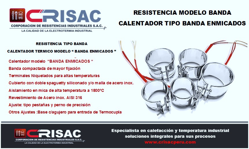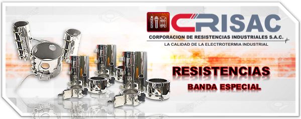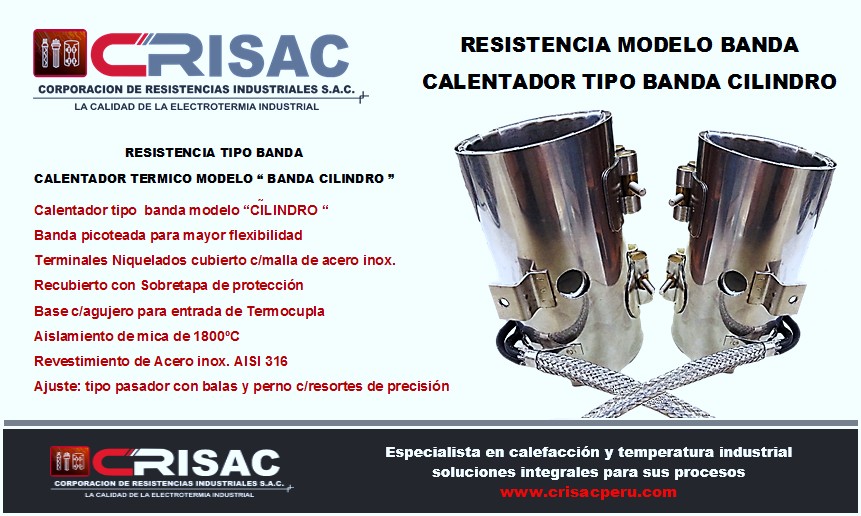 Las Resistencias tipo banda de CRISAC PERÚ, estas resistencias está compuesta por una cinta calefactora Ni Cr 80/20. Arrollada sobre una lámina de mica y aislada por láminas similares en ambas caras las cuales poseen un elevado aislamiento dieléctrico y optima conductividad térmica.