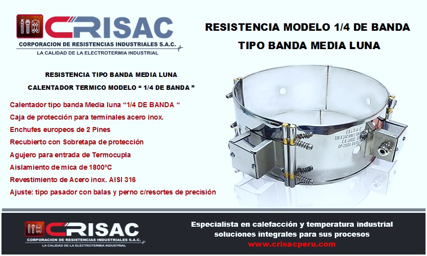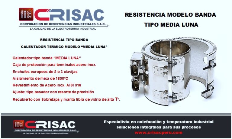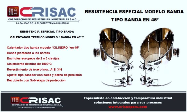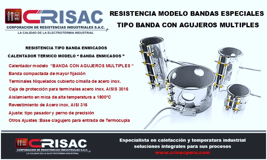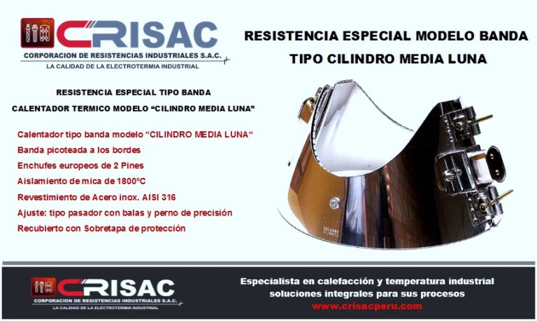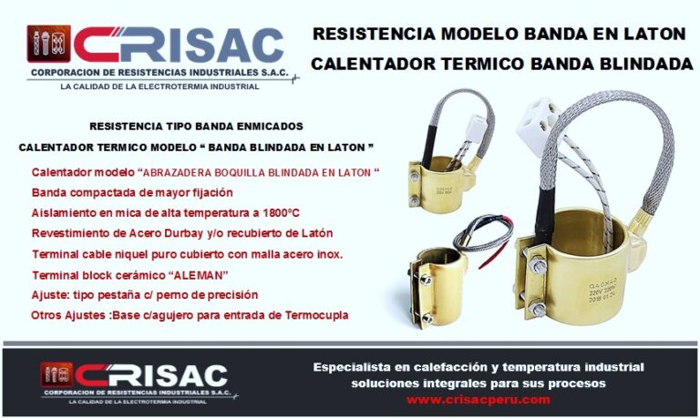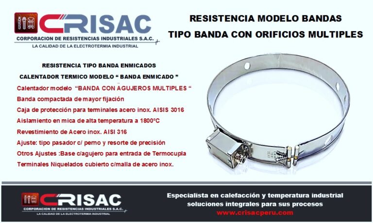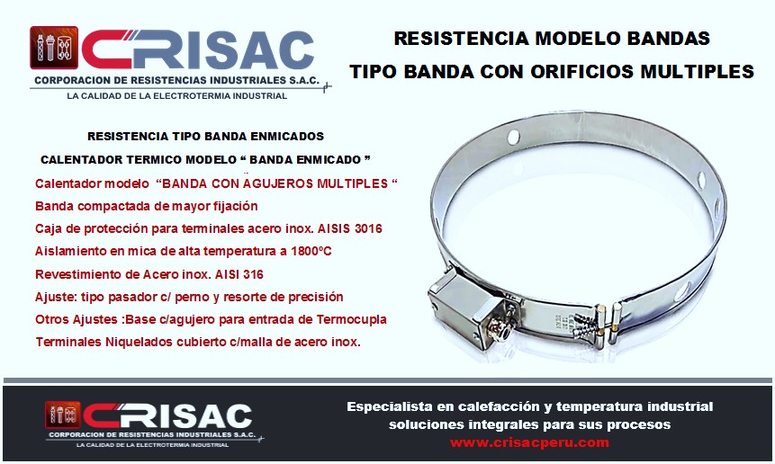 Las Resistencias tipo banda de CRISAC PERÚ, estas resistencias está compuesta por una cinta calefactora Ni Cr 80/20. Arrollada sobre una lámina de mica y aislada por láminas similares en ambas caras las cuales poseen un elevado aislamiento dieléctrico y optima conductividad térmica.