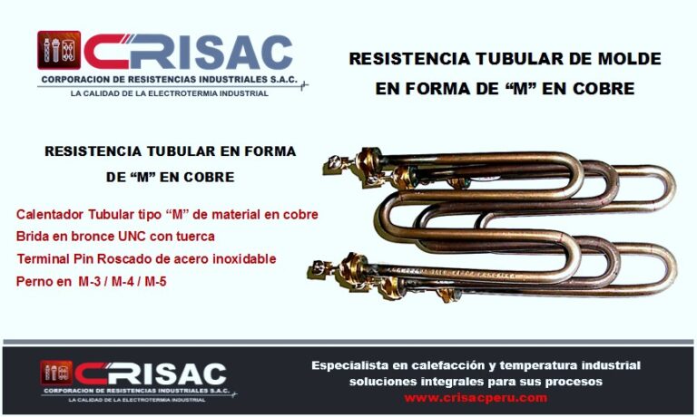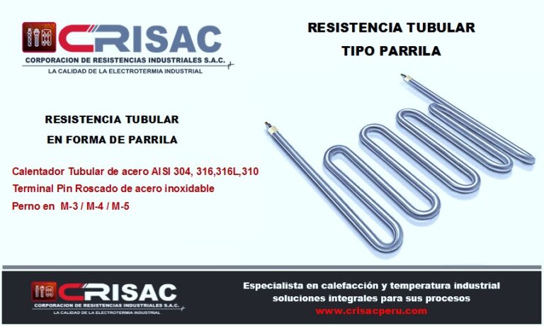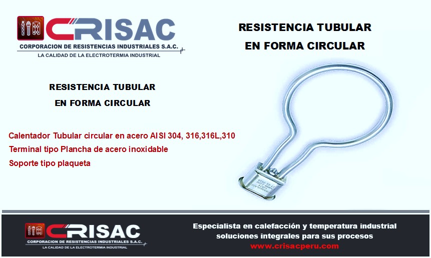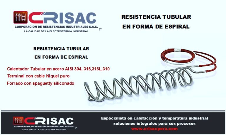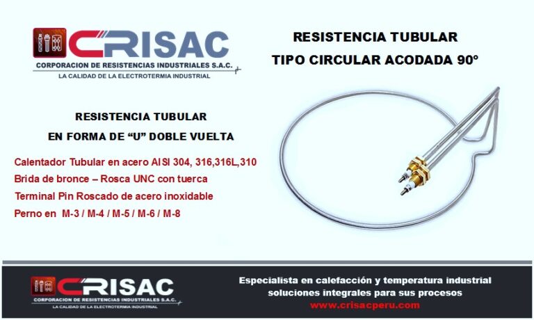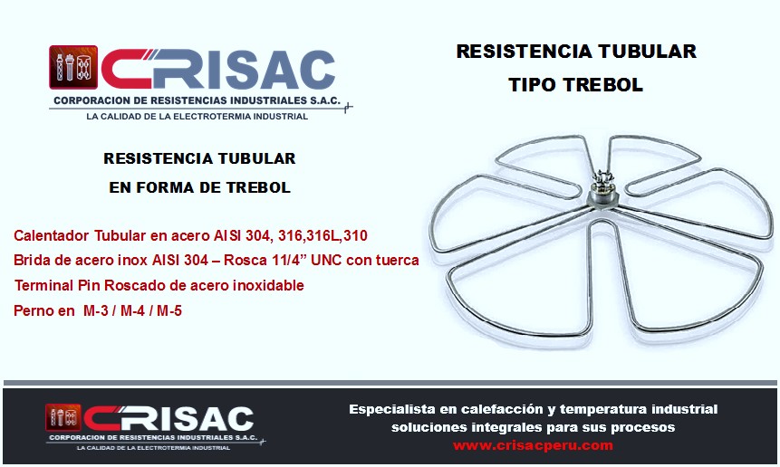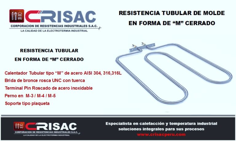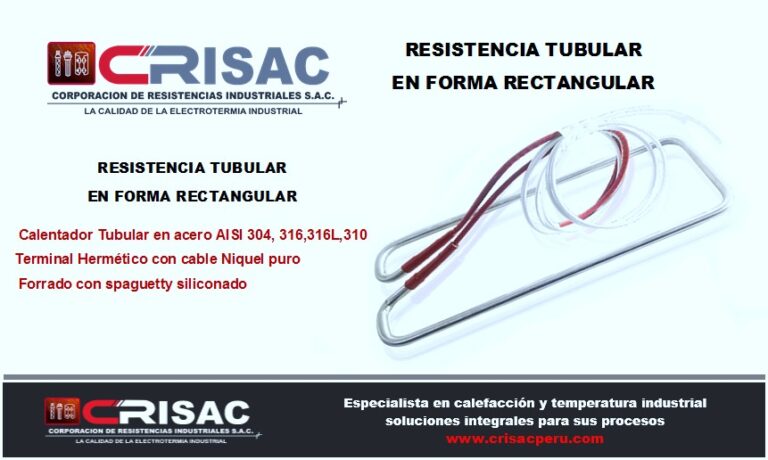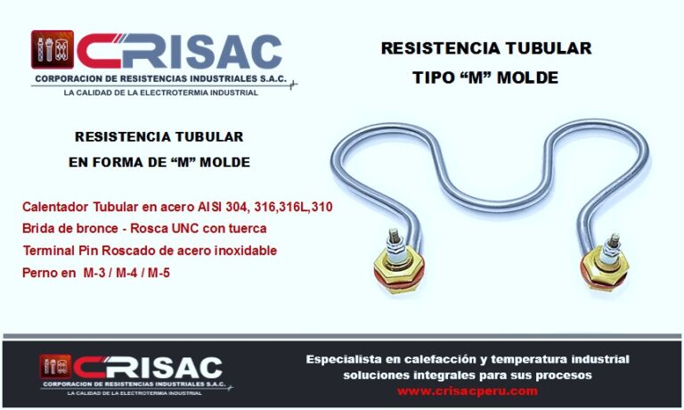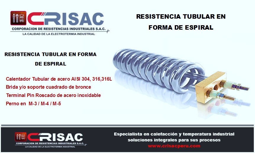 Las Resistencias tubulares superficiales y moldes de CRISAC PERÚ, están diseñadas de un material de primera calidad que resisten la corrosión y produce un calefactor robusto y durable inigualable en su resistencia contra el choque, vibraciones e impactos y altas temperaturas. Pueden ser formadas en una variedad ilimitada de figuras a piezas soldadas con plata o al acero latón, acero inoxidable o cualquier pieza de metal exótico. Así como fundidas en metales.