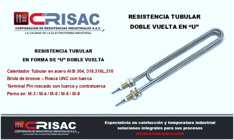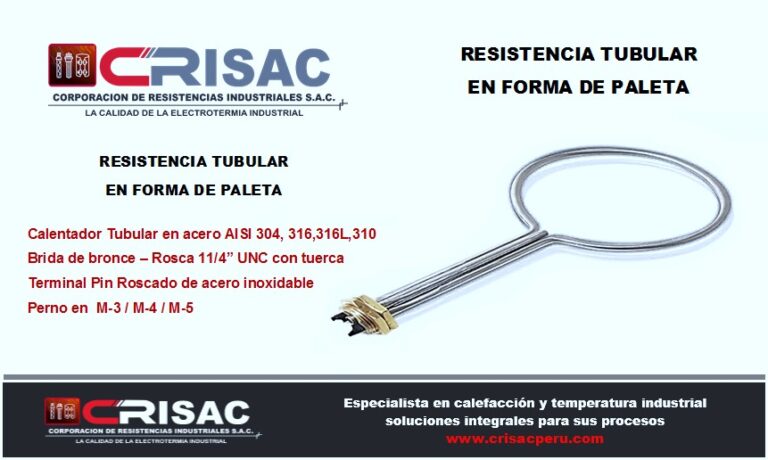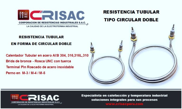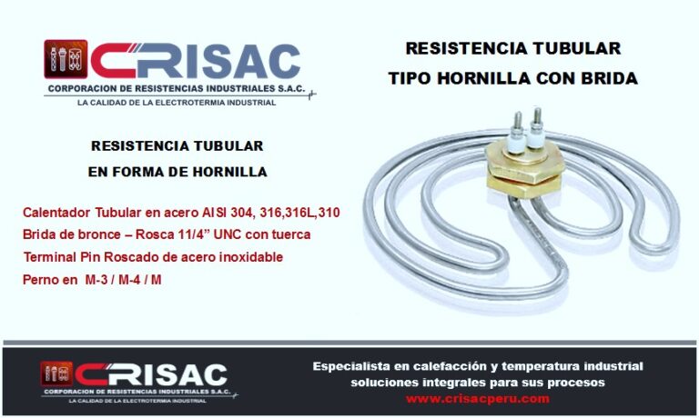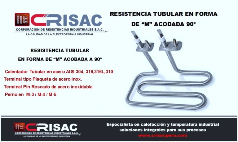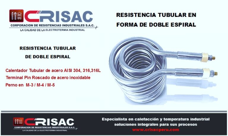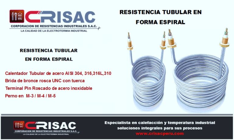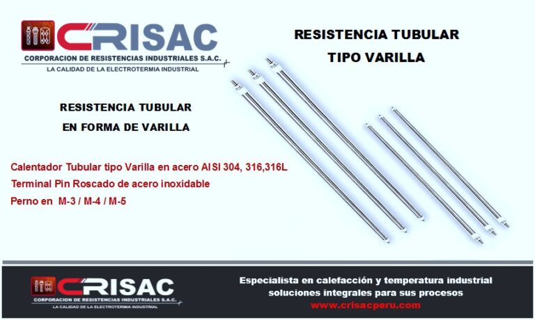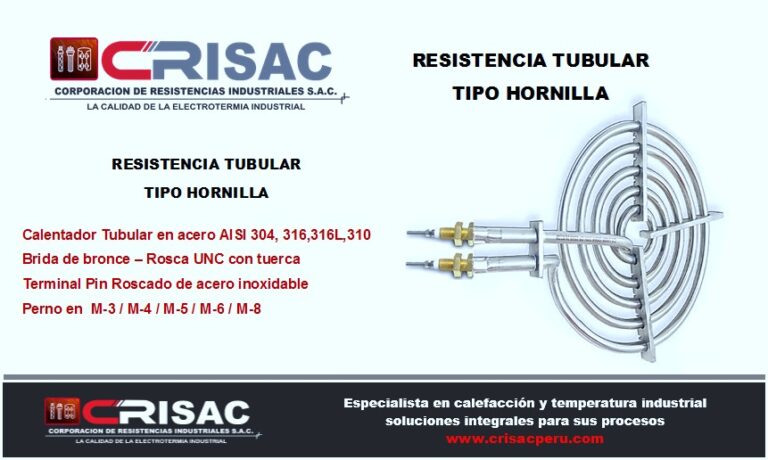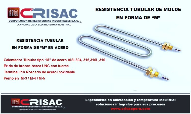 Las Resistencias tubulares superficiales y moldes de CRISAC PERÚ, están diseñadas de un material de primera calidad que resisten la corrosión y produce un calefactor robusto y durable inigualable en su resistencia contra el choque, vibraciones e impactos y altas temperaturas. Pueden ser formadas en una variedad ilimitada de figuras a piezas soldadas con plata o al acero latón, acero inoxidable o cualquier pieza de metal exótico. Así como fundidas en metales.