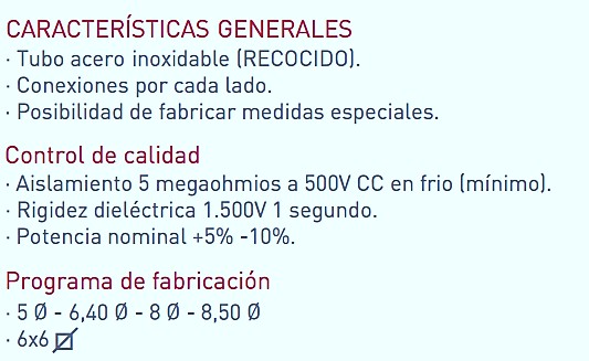 Son ideales para calentar sólidos, líquidos o gases, pueden trabajar insertados en un alojamiento directo o indirecto, fijado a un componente lo que permite transferir el calor en forma de conducción, radiación o convección.