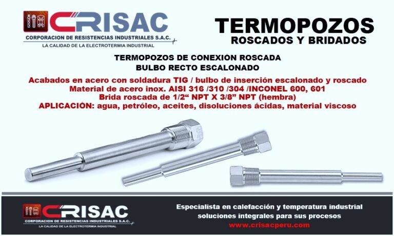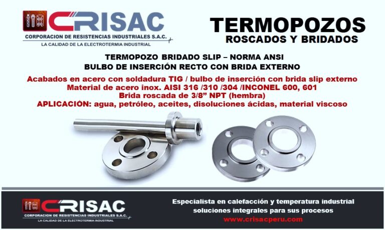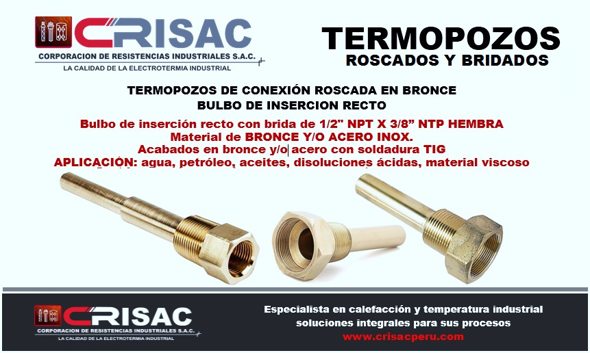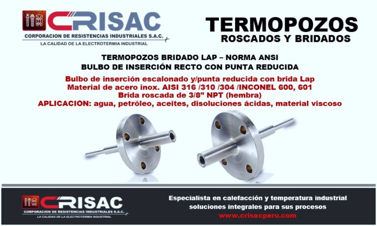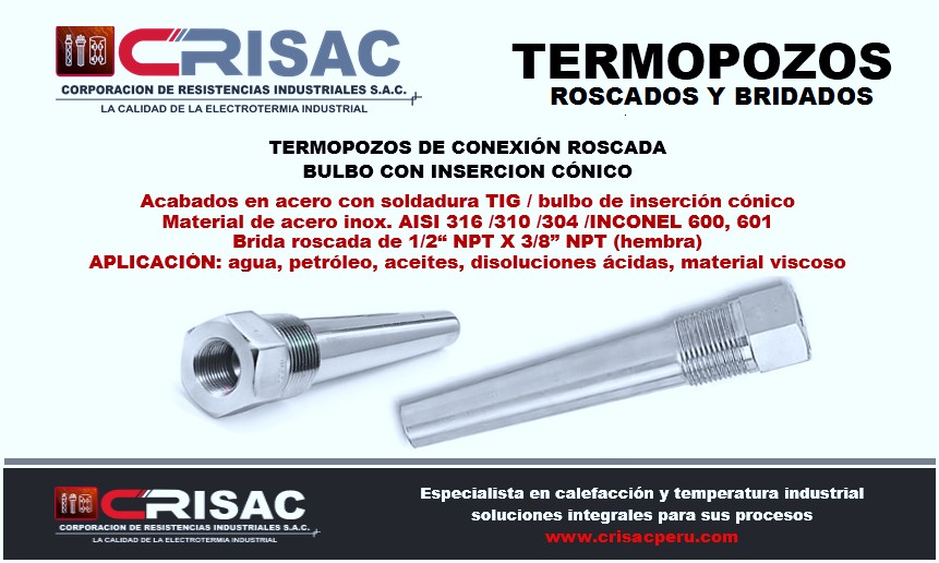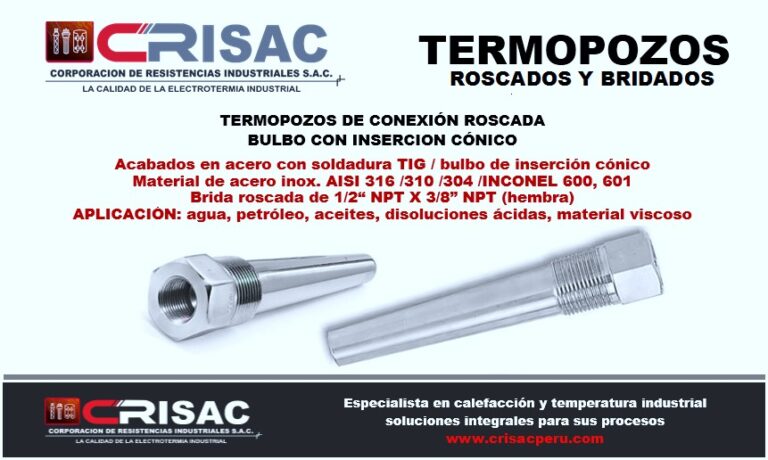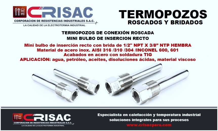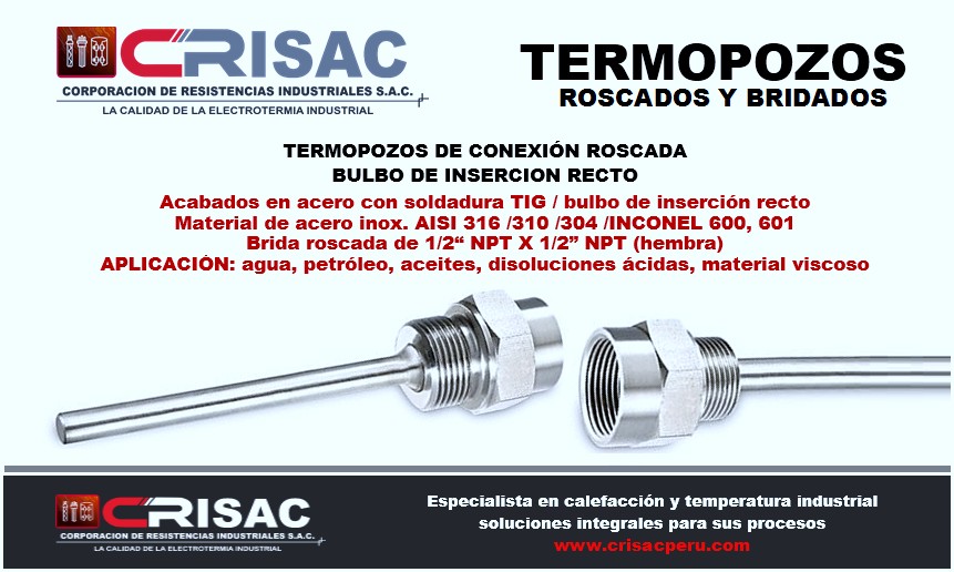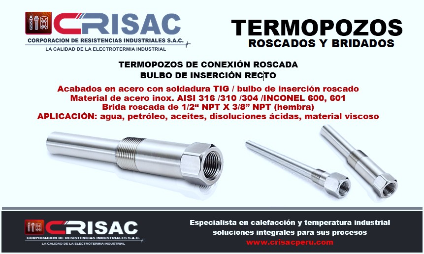 CRISAC PERÚ, fabrica todo tipo de accesorios, fundas y termopozos combinados o por separado, con diferente tipo de conexión (brida o roscado) esto es en funciona las especificaciones técnicas establecidas por el cliente o la aplicación. Su construcción es en distintos materiales o aleaciones para ser sometidas a altas presiones o con condiciones extremas producto de la alta temperatura. Usualmente los TERMOPOZOS Y FUNDAS se utilizan para proteger los sensores de temperatura contra los daños causados por presión excesiva, velocidad del material (Abrasión) o corrosión.