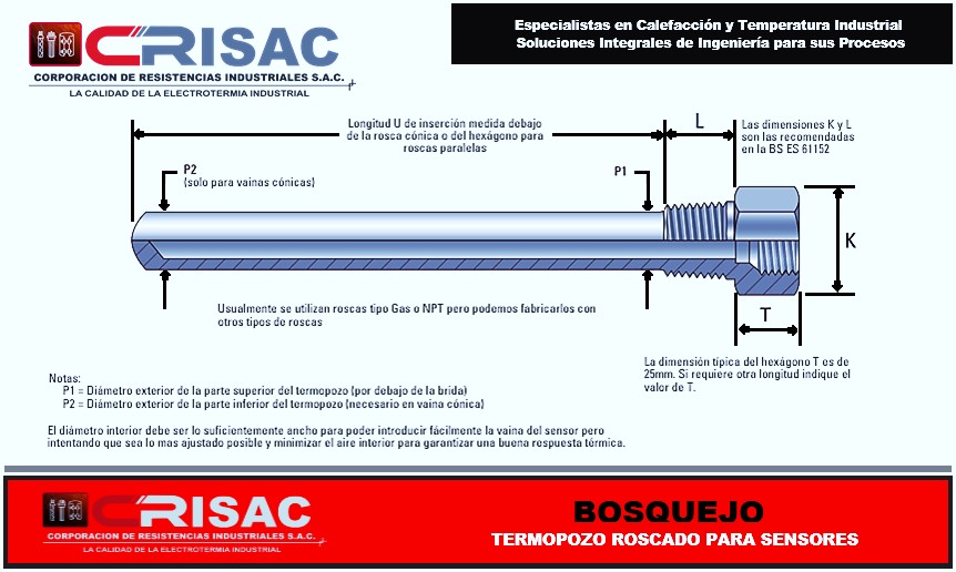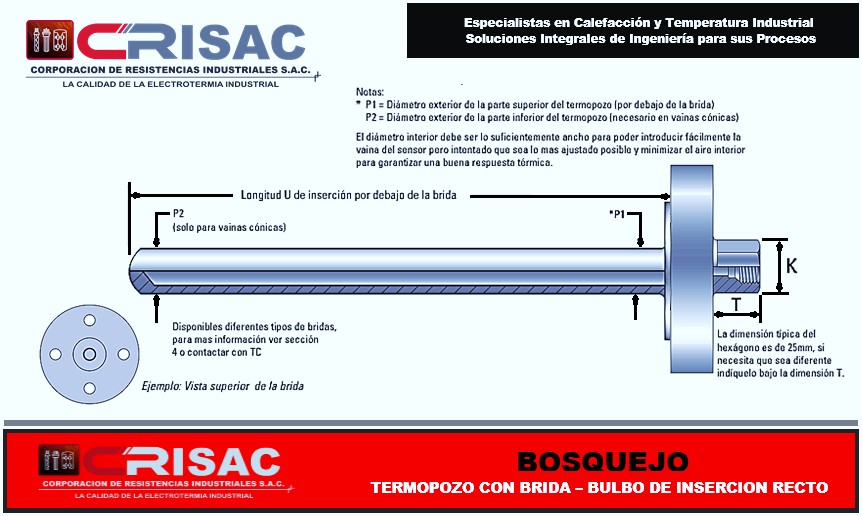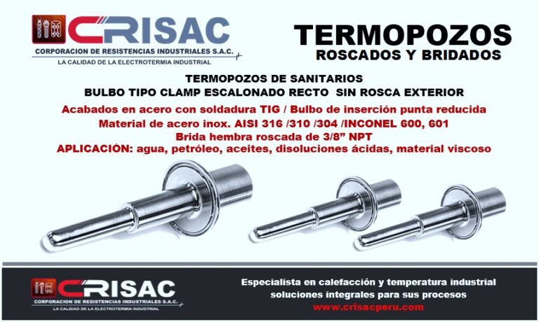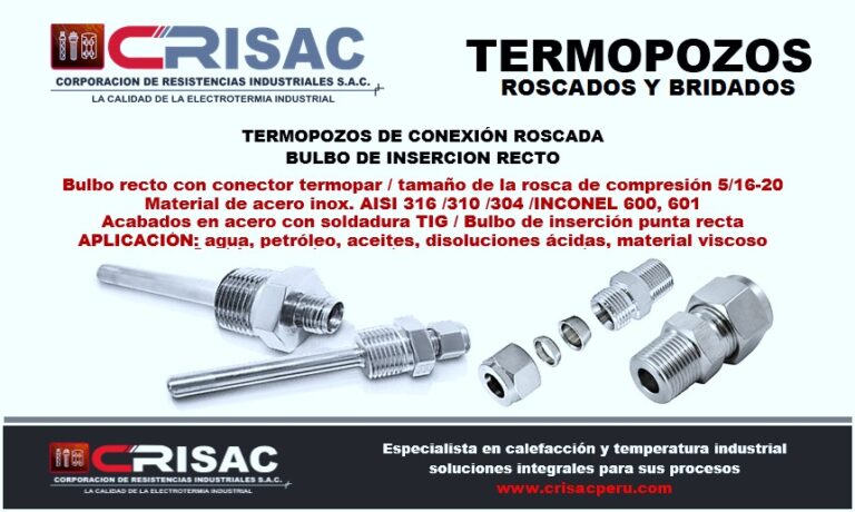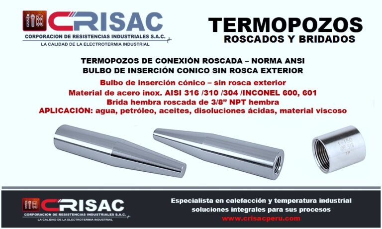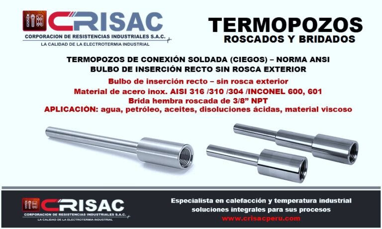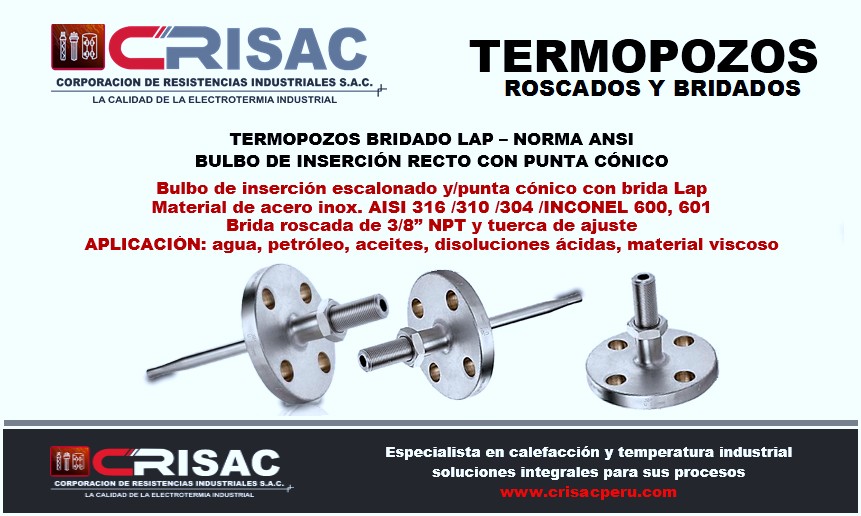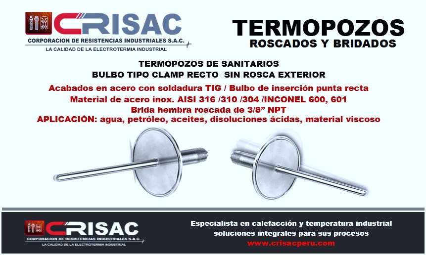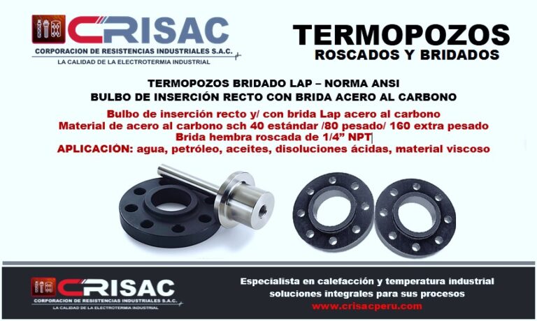 CRISAC PERÚ, fabrica todo tipo de accesorios, fundas y termopozos combinados o por separado, con diferente tipo de conexión (brida o roscado) esto es en funciona las especificaciones técnicas establecidas por el cliente o la aplicación. Su construcción es en distintos materiales o aleaciones para ser sometidas a altas presiones o con condiciones extremas producto de la alta temperatura. Usualmente los TERMOPOZOS Y FUNDAS se utilizan para proteger los sensores de temperatura contra los daños causados por presión excesiva, velocidad del material (Abrasión) o corrosión.